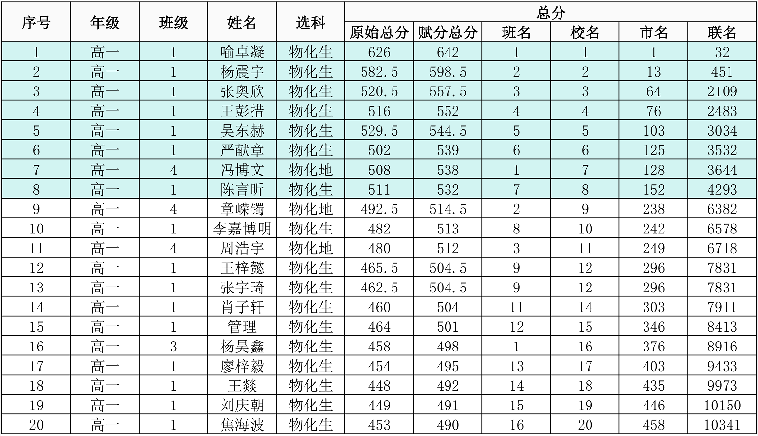 英语:1班 喻卓凝 物理:4班 周浩宇